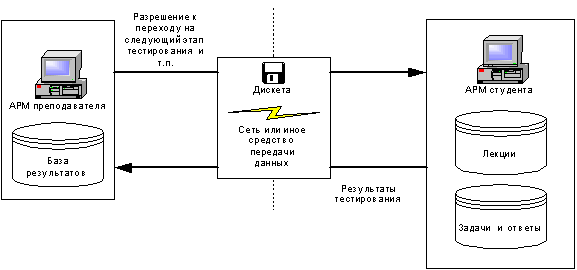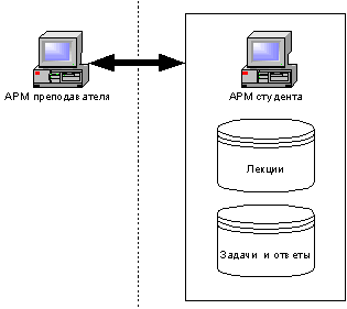 В таком случае уязвимым местом становятся такие объекты, как каналы связи между АРМ преподавателя и студента. Возможен вариант взаимодействия между этими АРМами в режиме off-line. Под уязвимыми объектами понимаются различные файлы (например с результатами промежуточного тестирования), с помощь которых и организуется информационное взаимодействие между АРМ. Уязвимы базы лекций, базы с задачами и ответами. Также само программное обеспечение может быть подвержено модификации. На рисунке 4 изображена структурная схема одной из возможной системы дистанционного обучения.