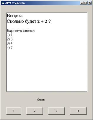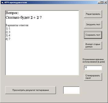 Итак, данная программа позволяет загрузить текст вопроса из файла, отредактировать его и опять сохранить. На практике, естественно, кроме этого должен существовать механизм генерации пакета программ и данных для студента. Т.е. в этот пакет, по всей видимости, должны входить АРМ студента, база данных и т.д. В нашем примере мы это опускаем и предполагаем, что сохраненный текст – все, что необходимо. Эта программа позволяет просмотреть файл с результатом тестирования по заданному вопросу. Это файл генерирует АРМ студента. Он представляет собой файл, в котором записано число – оценка за вопрос. Недостатки данной программы мы рассмотрим чуть ниже, когда познакомимся с АРМ студента. На рисунке 9 показан ее внешний вид.