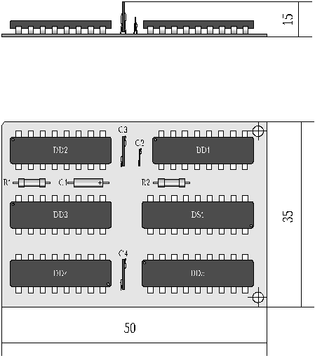 Печатная плата односторонняя, размеры 50 Х 35 мм, располагается внутри корпуса размером 62 Х 45 Х 25. Плата крепится к основанию корпуса с одной стороны на два винта, а с другой стороны край платы упирается в специальный выступ в корпусе.