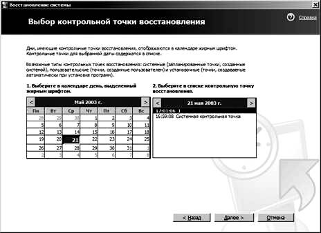 Устойчивые средства защиты системы. Типичным источником проблем в предыдущих версиях Windows было замещение жизненно важных системных файлов их устаревшими или некорректными версиями. Windows XP контролирует эти подмены, сохраняя правильную с точки зрения системы версию файла и одновременно позволяя приложению использовать нужные ему версии библиотек динамической компоновки. Дополнительная защита обеспечивается за счет средств восстановления, в соответствии с рисунком 1.1 , которые следят за системой и благодаря сохраненному «моментальному снимку» системных файлов и настроек позволяют выполнить «откат» к предшествующей конфигурации, если новое приложение или драйвер устройства вызывает проблемы.