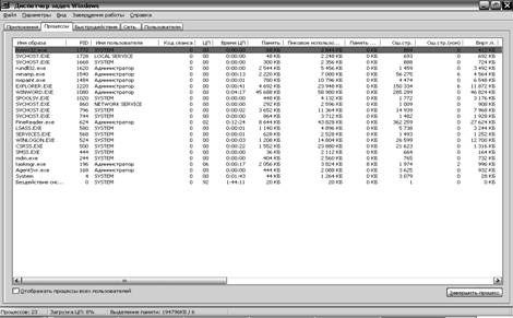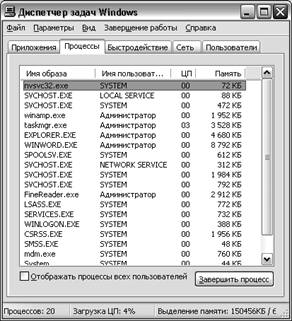 В этом коротком перечне показаны только процессы, доступные данному пользователю. Если установите флажок «Отображать процессы всех пользователей» (Show Processes From All Users), в списке появятся все исполняемые в данный момент процессы. В этом случае будут отображаться программы и приложения, выполняемые под встроенными учетными записями System, Network Service и Local Service.