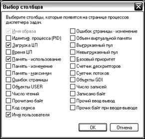 Немного потрудившись, можно настроить вкладку Процессы так, что на ней будет располагаться гораздо больше информации о каждом выполняемом процессе, чем в предлагаемом по умолчанию режиме. Чтобы изменить состав столбцов этой вкладки, выберите пункт Вид