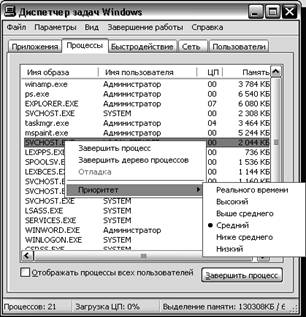 Каждый выполняемый процесс в системе Windows обладает приоритетом (base priority). Этот параметр определяет, какая часть времени процессора отдается данному процессу. По умолчанию приоритет всех процессов устанавливается как Нормальный. Некоторые важные системные службы выполняются с Высоким приоритетом (список возглавляют Диспетчер задач, Вход в систему и Подсистема клиент/сервер — csrss.exe). Эти задачи получают ресурсы процессора даже в том случае, если какая-нибудь из обычных программ целиком завладевает им.