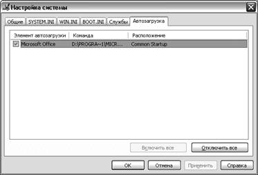 На рисунке 2.12 показана вкладка Автозагрузка утилиты Настройка системы, на которой выведен список всех автоматически запускаемых программ — имена и полные пути к исполняемым файлам, запускающим эти программы, а также местоположение записей, обеспечивающих автоматическое выполнение.