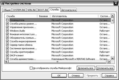 Некоторые службы жизненно важны для работы Windows, другие предоставляют дополнительные возможности и могут быть спокойно отключены для освобождения памяти и других ресурсов. Вкладка Службы (Services) утилиты Настройка системы, показанная на рисунке 2.13, позволяет временно отключить одну или несколько служб, чтобы проверить работоспособность системы в их отсутствие.