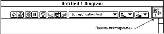 Каждый VI имеет заданную по умолчанию пиктограмму, которая отображается в области “Окна Пиктограммы” в верхнем правом углу “Окна блок-схемы” и “Окна передней панели”. Такая пиктограмма приведена на рис.4.: