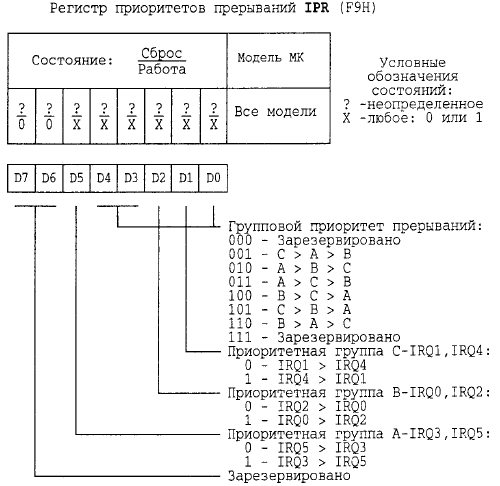 Регистр приоритета прерываний IPR (рис.1.27) позволяет устанавливать любое соотношение приоритетов как между группами прерываний А, В, С, так и между отдельными запросами прерываний внутри группы. В каждую группу включено по два запроса.