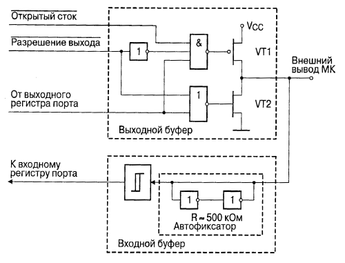 Схемотехника портов P0, P1, P2 поясняется рис. 1.13. Двухтактный буферный выходной усилитель выполнен на комплементарных МОП-транзисторах VT1 и VT2. Отключение транзистора VT1 переводит буферный усилитель в конфигурацию с открытым стоком. Входной буфер содержит автофиксатор и триггер Шмитта, который обеспечивает формирование входного сигнала.