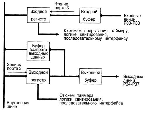 Порт P3 содержит четырехбитные входной и выходной регистры, входной и выходной буферы. Наличие четырехбитного буфера возврата позволяет при чтении порта P3 контролировать данные на выходных линиях. Запись информации в младшую тетраду порта P3 не имеет эффекта.