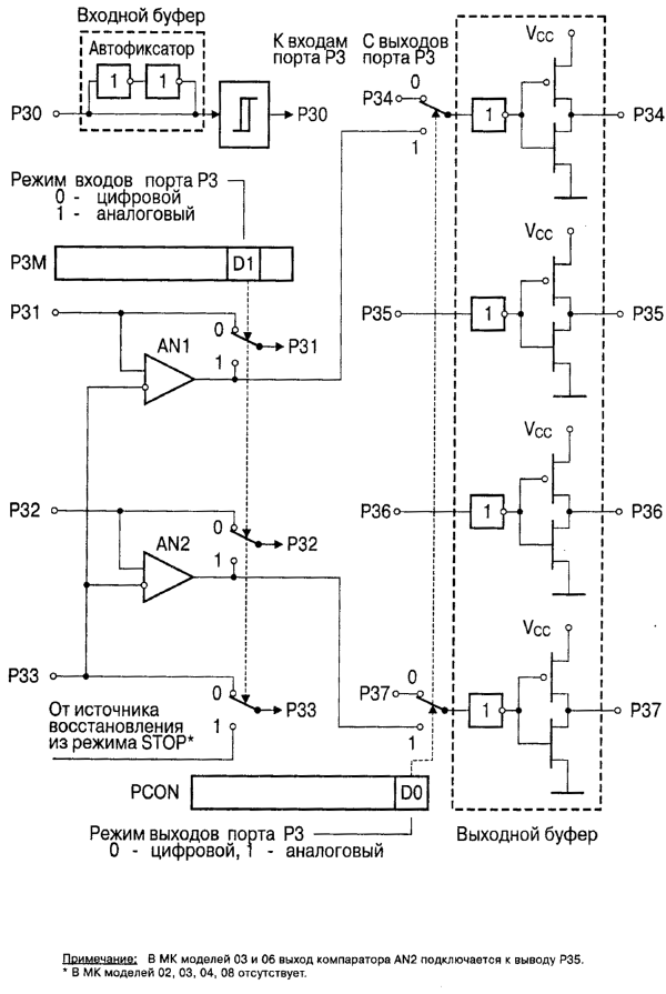 Схемотехника порта P3 иллюстрируется рис. 1.15. Дополнительной особенностью МК является наличие двух встроенных аналоговых компараторов AN1 и AN2, позволяющих решать вопросы сравнения аналоговых сигналов, квантования сигналов, аналого-цифрового преобразования. Входы и выходы порта P3 используются для обслуживания аналоговой схемы. Переключение входов в аналоговый режим осуществляется битом D1 регистра режима порта 3 PЗM, а выходов -битом D0 регистра управления портами PCON. Входы P31 и P32 используются соответственно для неинвертирующих входов компараторов, а вход P33 является входом опорного напряжения REF, общего для AN1 и AN2.