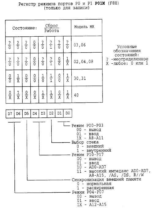 Управление работой портов реализуется путем записи информации в управляющие регистры: регистр режимов портов P0 и P1 -P01M, регистр режима порта P2 -P2M, регистр режима порта P3 -P3M. Все эти регистры находятся в рабочей группе F стандартного РФ. В моделях 03, 06, 30, 31 и 40, кроме того, для управления режимами работы выходных буферов портов (режим "открытый сток" и малошумящий режим) задействован регистр управления портами PCON, расположенный в расширенной группе регистров F. Все эти регистры предназначены только для записи. Результат чтения этих регистров будет равен FFH.