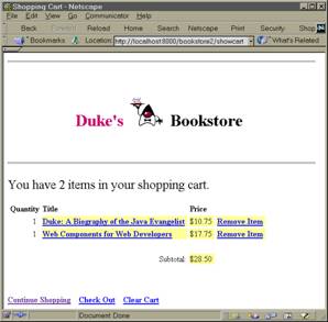 Страничка примера bookstore showcart.jsp импортирует классы, необходимые, чтобы реализовать карту покупок (shoppingcart), с помощью следующей директивы: