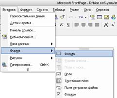 · В меню Вставка выбрать пункт Форма, в открывшемся меню снова выбрать пунктФорма. Форма будет помещена на вашу Web-страницу — появиться область, помеченная пунктирной рамочкой, с двумя кнопками: Отправить и Сброс.
