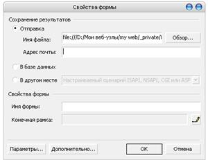 o Отправка Адрес почты — в этом случае каждый раз при нажатии посетителем Web-странички кнопки Отправить на форме будет генерироваться электронное сообщение, которое будет отправляться по указанному вами адресу. В этом сообщении будут содержаться все данные, которые были введены пользователем на Web-страничке.