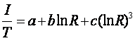 Где Т- абсолютная температура (в градусах Кельвина), R – сопротивление термистора; а, b и с –экспериментально полученные константы.