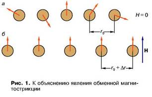 Возникновение обменной магнитострикции можно наглядно пояснить следующим образом. Представим себе, что имеется цепочка магнитных атомов при температурах, близких к ТC. В области ТC большинство моментов Мат находятся в разупо-рядоченном состоянии, так как действие теплового движения на атомы больше, чем обменное взаимодействие. Пусть r0 — равновесное расстояние между атомами, соответствующее этому состоянию ферромагнетика (рис. 1, а). Включим теперь поле Н. Моменты Мат повернутся по полю (рис. 1, б), но это приведет к изменению обменной энергии (поскольку, согласно теории, данная энергия зависит от направления спинов взаимодействующих электронов, принадлежащих соседним атомам).