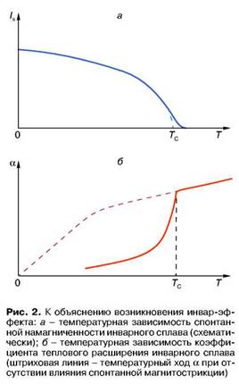 У некоторых ферромагнетиков эффект спонтанной магнитострикции оказывает существенное влияние на тепловое расширение, так как приводит к частичной компенсации последнего. На рис. 2, б штриховой линией схематически показан температурный ход коэффициента теплового расширения α = 1/l(dl/dТ) ферромагнитного сплава 36%Ni + + 64%Fe при отсутствии компенсирующего действия обменной магнитострикции, сплошная кривая — зависимость α(T), экспериментально наблюдаемая. Видно, что в определенном интервале температур а может приобретать очень низкие значения.