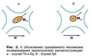 Как показали исследования, главным для анизотропной магнитострикции является одноионный механизм. Определяющую роль в нем играет наличие у магнитного атома или иона (то есть заряженного атома) орбитального магнитного момента Морб. Согласно теории, в этом случае электронное орбитальное облако приобретает несферическую (анизотропную) конфигурацию (на рис. 3, а оно условно изображено в виде эллипсоида). Наглядно механизм возникновения анизотропной магнитострикции можно представить следующим образом. Пусть анизотропный магнитный ион находится в кристаллической решетке в окружении других ионов, создающих электростатическое поле (оно обычно называется кристаллическим).