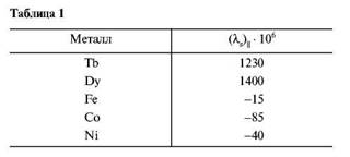 В табл. 1 приведены результаты измерения продольной магнитострикции насыщения (λs)11 (то есть в полях H = Hs) при температуре жидкого азота 78 К в поликристаллах Tb и Dy (для сравнения даны соответствующие значения (λs)11 для поликристаллов Fe, Co и Ni).