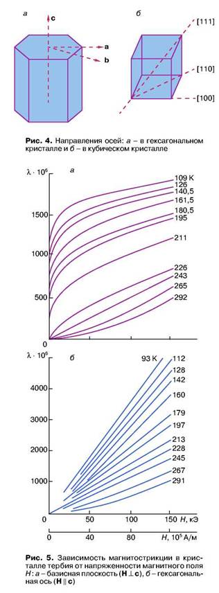 Огромных величин достигает λs в гексагональных кристаллах Tb и Dy (табл. 2). При этом она особенно велика вдоль гексагональной оси c и несколько меньше вдоль a. (На рис. 4, а показаны направления этих осей.) Видно, что эти значения в сотни раз больше, чем в кристалле Ni. (На рис. 4, б показаны направления осей кубического кристалла Ni символами [111], [100] и [110].)