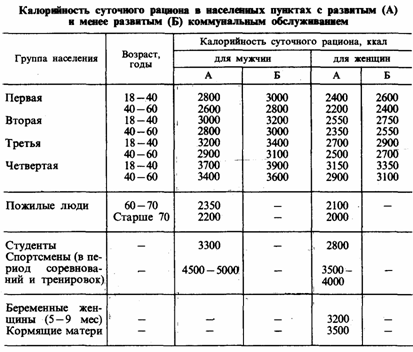 Определенное снижение метаболизма и значительное изменение трудовой деятельности обычно наблюдается у людей пожилого и особенно преклонного возраста, что должно обусловливать закономерное уменьшение калорийности их рациона. Известные различия в суточном калораже находятся в зависимости от бытовых условий жизни населения, причем в городах с развитым коммунальным обслуживанием отмечается понижение энергетических трат организма благодаря наличию водопровода, канализации, центрального отопления, системы общественного транспорта и др. Это объясняет большую величину соответствующих показателей, рекомендуемых для сельских жителей. Наконец, при оценке калорийности питания взрослого населения учитывают занятия физкультурой и спортом, а также другие формы активного отдыха, повышающие энергетическую потребность человека примерно на 200-300 ккал.