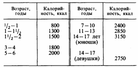 Наибольшей возрастной спецификой отличаются детские контингенты, для 7 групп которых разработан пищевой рацион (табл. 2). Он зависит от интенсивности энергетических и пластических процессов, обеспечивающих рост и развитие организма, причем для детей до 5 лет относительная калорийность питания составляет 80 – 100 ккал/кг. Соответствующие же цифры для взрослых достигают всего лишь 53 ккал.