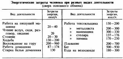 Следует подчеркнуть, что при установлении рекомендаций по калорийности и качественному составу пищевого рациона за основу была принята средняя идеальная масса тела, равная для мужчин 70 кг, для женщины 6.0 кг. Таким образом, эти усредненные показатели не учитывают (и не могут учитывать) детальных особенностей труда различных профессиональных групп работающих. Для указанных целей были проведены специальные исследования, результатом которых явилось более точное определение затрат энергии при выполнении тех или иных видов работы (табл. 3). Для примера можно привести следующие данные: слушая и записывая лекцию, студент в общей сложности затрачивает до 120 ккал/ч, а при проведении практических занятий в стоячем положении – около 180 ккал/ч, лектор же при чтении лекции в большой аудитории расходует 140 – 270 ккал/ч. Однако даже эти детализированные показатели величины энергетического обмена нельзя рассматривать как постоянные и неизменные, ибо расход энергии во многом зависит от квалификации работающего, условий труда, индивидуальных особенностей организма и некоторых других факторов. В частности, установлено, что энерготраты у квалифицированного рабочего всегда меньше, чем у нетренированного, так как первый выполняет аналогичные производственные операции с, меньшим напряжением, производя только необходимые движения.