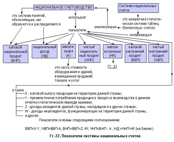 На основе ВВП рассчитываются показатели национальных счетов, широко используемые в экономической теории и статистике. Система национальных сетов связывает воедино важнейшие экономические показатели – объем выпуска товаров и услуг, совокупные доходы и расходы общества. СНС представляет собой современную систему сбора и обработки информации и применяется практически во всех странах для макроэкономического анализа рыночной экономики. Она позволяет в наглядной форме представить ВВП (ВНП) на всех стадиях его движения, т.е. производства, распределения, перераспределения и конечного использования. Ее показатели отражают структуру рыночной экономики, институты и механизмы функционирования. Использование СНС необходимо для проведения эффективной макроэкономической политики государства, экономического прогнозирования, для международных сопоставлений национального дохода. Ниже приведена краткая схема