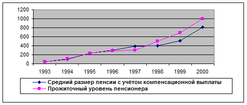 С начала 90-х годов минимальная пенсия постоянно ниже уровня прожиточного минимума пенсионера, а в 1998 году отчётливо проявилась тенденция к тому, что средняя выплаченная пенсия не достигает этой величины, что показано на рисунке 2.1: