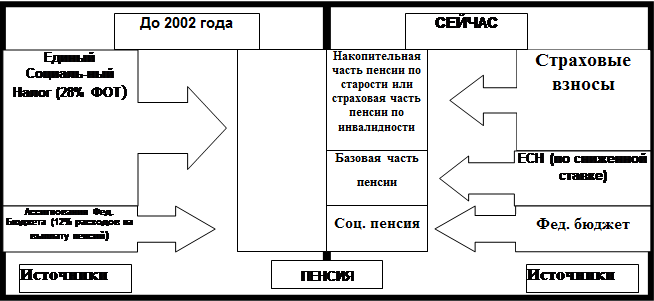 С началом реформы – с 1 января 2002 года – началась конвертация пенсионных прав граждан, ознаменовав тем самым переход от распределительной к условно-накопитель-ной (распределительно-накопительной) системе пенсионного обеспечения. Она коснулась и тех, кто уже на пенсии, и тех, кто, заработав тот или иной объём прав в рамках старой пенсионной модели, продолжает работу до достижения пенсионного возраста или после него. Структура источников финансирования и новая структура пенсий (а также действовавшая до 1.01.02 года) представлены на рисунке 2.2.