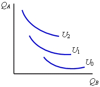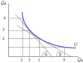 Из-за выпуклости кривой безразличия к началу координат абсолютное значение MRSB,A уменьшается по мере движения вдоль кривой безразличия слева направо. Предельная норма замещения двух благ всегда отрицательна по определению.