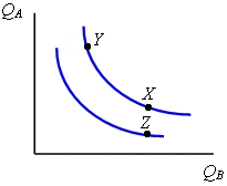 Все множество кривых безразличия в пространстве двух благ образует карту безразличия. Она однозначно выражает предпочтения потребителя и позволяет предсказать его отношение к любым двум сочетаниям различных благ. Так, глядя на карту безразличия, представленную на рис. 3.5, можно утверждать, что потребитель из двух комбинаций, соответствующих точкам Y и Z, выберет первую, поскольку по гипотезе ненасыщения он предпочитает точку Х точке Z, а Y и Х для него равнозначны, так как лежат на одной и той же кривой безразличия. Следовательно, чем дальше кривая безразличия расположена от начала координат, тем большему уровню благосостояния она соответствует.