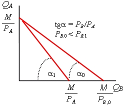Уравнение (3.11) называют уравнением бюджетной линии, все точки которой представляют доступные потребителю при данном бюджете комбинации двух благ. Из выражения (3.11) служит, что бюджетная линия имеет отрицательный наклон; угол ее наклона определяется соотношением цен, а отдаленность от начала координат - величиной бюджета. Если при фиксированном бюджете и неизменной цене блага А цена блага В снижается, то наклон бюджетной линии уменьшается: