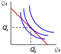 Точка касания бюджетной линии с наиболее отдаленной кривой безразличия указывает на искомый Q*A,Q*B набор покупаемых благ. Формальным признаком достижения потребителем максимальной удовлетворенности при заданном бюджете является равенство абсолютного значения предельной нормы замещения двух благ соотношению их цен: