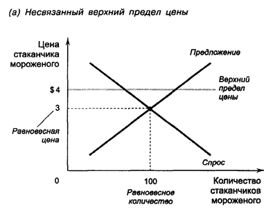 Если правительство, подталкиваемое жалобами потребителей мороженого, устанавливает потолок цены, ее воздействие на рынок мороженого зависит от соотношения рыночной и предписанной государством цены. В том случае, когда правительство устанавливает верхний предел цены в $ 4 (выше цены, уравновешивающей спрос и предложение $ 3), на рынке возникает ситуация, представленная на графике (а) рис. 1.1. В таком случае предельная цена называется несвязанной. Рыночные силы естественно движут экономику к равновесию, а установленный потолок не оказывает в этом случае существенного влияния.[13,135]