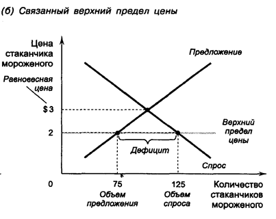 График (б) на рис. 1.1 иллюстрирует другой, более интересный вариант, когда правительство определяет верхний предел цены в размере $ 2 за стаканчик. Так как равновесная цена в $ 3 выше установленной государством цены, предельную цену называют сдерживающим ограничением рынка. Силы спроса и предложения движут цену к равновесной цене, но рыночная цена «ударяется о потолок», препятствующий ее росту, и устанавливается на уровне верхнего предела цены. При этой цене объем спроса на мороженое (125 стаканчиков) превышает объем предложения (75 стаканчиков). Возникает дефицит мороженого, а значит, некоторые потребители, желающие приобрести мороженое, при существующей цене не смогут это сделать.