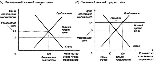 Когда правительство устанавливает пол для цен на мороженое, возможны два результата. Если правительство устанавливает нижний предел цены в размере $ 2 за стаканчик, а равновесная цена составляет $ 3, мы получаем результат, представленный на графике (а) рис. 1.2. Так как равновесная цена находится выше пола цены, нижний предел цены несвязан и рыночные силы естественно движут экономику к равновесию. Нижний предел цены в этом случае не оказывает никакого воздействия на состояние рынка.