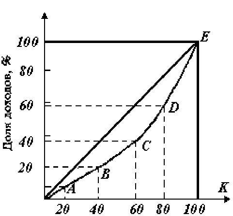 Для графического изображения персонального распределения национального дохода строится кривая Лоренцав следующей системе координат: по оси абсцисс отражается доля семей в общей численности семей страны, по оси ординат — доля принадлежащего им национального дохода.