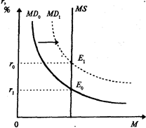 Пусть спрос на деньги возрос вследствие роста номинального ВНП, т.е. население и фирмы предпочитают держать свои активы в денежной форме. Следовательно, процентная ставка повышается и устанавливается новая точка равновесия при более низкой, чем первоначальная, ставке процента.