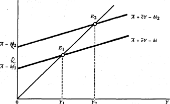 где i представляет собой уровень процентной ставки, а b измеряет ее влияние на инвестиции, I~ обозначает автономные инвестиционные расходы, т.е. инвестиционные расходы, которые не зависят ни от дохода, ни от уровня процента для автономных инвестиций.