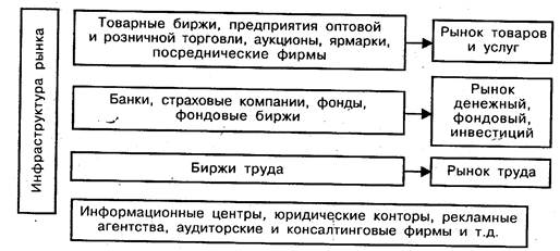 На рынке товаров и услуг инфраструктура представлена товарными биржами, предприятиями оптовой и розничной торговли, фирмами, предоставляющими участникам рыночную информацию, занимающимися маркетингом, рекламой и т. д. Эта часть инфраструктуры охватывает огромное экономическое пространство между производителями и потребителями; ее функционирование обеспечивает регулирование сбыта и обслуживание потребителей. Эта инфраструктура реагирует на сигналы, идущие от спроса, и обеспечивает равновесие на товарном рынке.