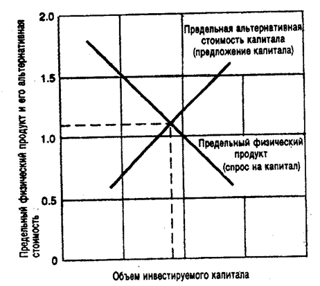 Точка равновесия на графике, отражающая оптимальное соотношение между объемом сегодняшних товаров и их гипотетическим количеством в будущем, и, следовательно, указывающая на оптимальный баланс инвестируемого капитала, определяется пересечением графиков спроса и предложения капитала, Вне ее создается следующая ситуация: рост объема инвестированного капитала повышает физический объем продукции, которая будет произведена в будущем, выше уровня паритета, соотнесенного с сокращением сегодняшнего производства. И хотя предельный физический продукт может оставаться больше единицы, его увеличение не в состоянии компенсировать альтернативную стоимость капитала, обеспечивающего этот прирост.