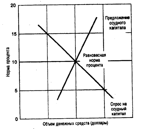 Все хозяйственные агенты — те, кто берет деньги в долг или предоставляет средства для займов — безотносительно причин, побуждающих на такие действия, оперируют на рынках, которые экономисты называют рынками ссудного капитала. Графически ситуация на этих рынках представлена на рис. 2. Кривая спроса на ссудный капитал показывает, что при прочих равных условиях хозяйственные агенты будут чаще прибегать к услугам рынка ссудного капитала, направляя эти средства как на инвестиции, так и на потребление, при норме процента ниже равновесной. Аналогично характер кривой предложения демонстрирует, что увеличение нормы процента выше равновесного уровня способствует росту предложения средств на этом рынке. Равновесная норма процента на рынке ссудного капитала определяется пересечением кривых спроса и предложения.