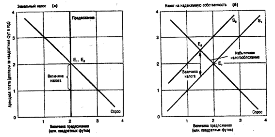 На рис. 4 приводится сопоставление двух различных форм налогообложения: земельного налога и налога на здания, сооружения, недвижимую собственность и иные вложения капитала в благоустройство земельных угодий. Предположение зданий и сооружений на рынке недвижимости не является совершенно неэластичным. Налоги на этот вид собственности означают увеличение затрат для конкретных владельцев, что в графической интерпретации сдвигает кривую рыночного предложения данного товара на рынке вверх. По мере того, как рыночные ставки арендной платы увеличиваются, часть этого налогового бремени перекладывается на плечи арендаторов, Вследствие этого начинает сокращаться предложение — капитальное строительство и ремонт замораживаются, а устаревшие здания и сооружения ввиду их нерентабельности сносятся.