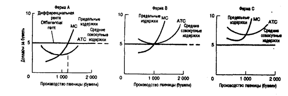 При фиксированной цене пшеницы и определенном уровне издержек производства ферма А получает доход в 5 долларов за бушель пшеницы и несет средние совокупные издержки, составляющие 3 доллара на каждый произведенный бушель зерна. Излишек .в 2 доллара определяется качеством земли и ее плодородностью на ферме А (в общем случае его принято называть дифференциальной рентой).