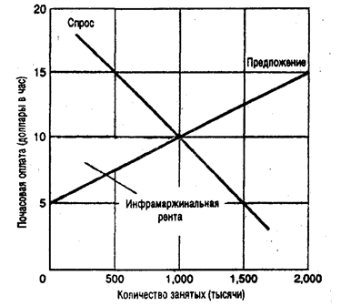 В графической интерпретации существующий положительный наклон кривой предложения на этом рынке характеризует наличие альтернативной стоимости привлекаемой рабочей силы. В положении равновесия на рынке конкурирующей рабочей силы огромное большинство занятых (кроме немногих, с трудом согласившихся на эту работу при существующей оплате) получают жалованье, превышающее их альтернативную стоимость, что, согласно принятой в микроэкономике терминологии, означает получение ими инфра-маржинальной ренты.