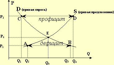 Из этого графика видно, что лишь при цене на исследуемый товар P=P0 планы как покупателей, так и продавцов оправдаются полностью: покупатели запланированным оптимальным образом удовлетворят свои потребности, а поставщики получат запланированную оптимальную прибыль. Если же на рынке в данный момент существует цена P1< P0, то это означает, что покупатели готовы купить товара в объеме Q3 (точка B на графике), тогда как продавцам выгодно поставить товара лишь в количестве Q2<Q3 (точка A на графике) – таким образом, при такой цене часть спроса останется непокрытой предложением, то есть возникнет ситуация избыточного спроса (т.е. дефицита данного товара на рынке в количестве Q3-Q2). Соответственно, если на рынке в данный момент существует цена P2>P0, то это означает, что покупатели готовы купить товара в объеме Q1 (точка C на графике), тогда как продавцам выгодно поставить товара лишь в количестве Q4>Q1 (точка D на графике) – таким образом, при такой цене часть предложения останется непокрытой спросом, то есть возникнет ситуация избыточного предложения (т.е. профицита, излишка данного товара на рынке в количестве Q4-Q1).