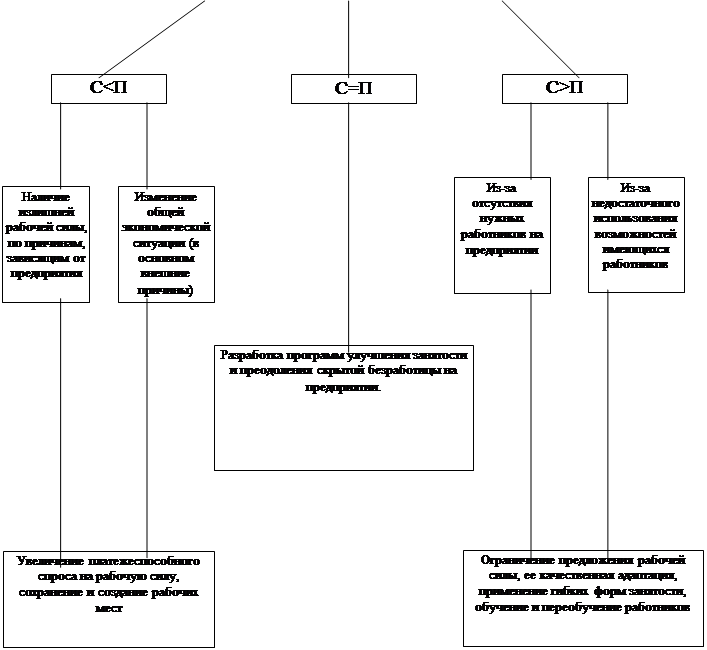 Далее разрабатывается программа мероприятий по улучшению занятости, уменьшению скрытой безработицы, снижению текучести. В зависимости от состояние спроса и предложения рабочей силы на предприятии используются две группы мер:
