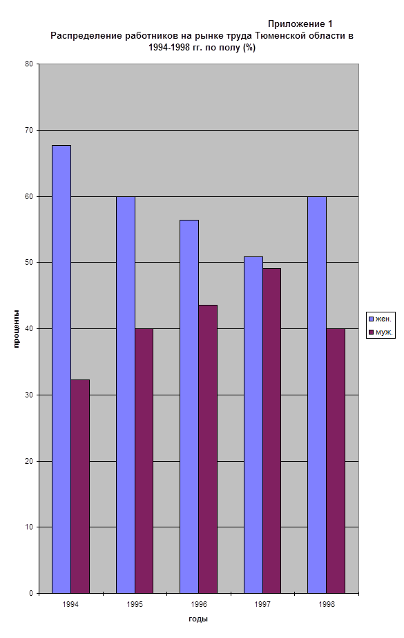 1. Диаграмма распределения работников на рынке труда Тюменской области в 1994-1998 гг. по полу