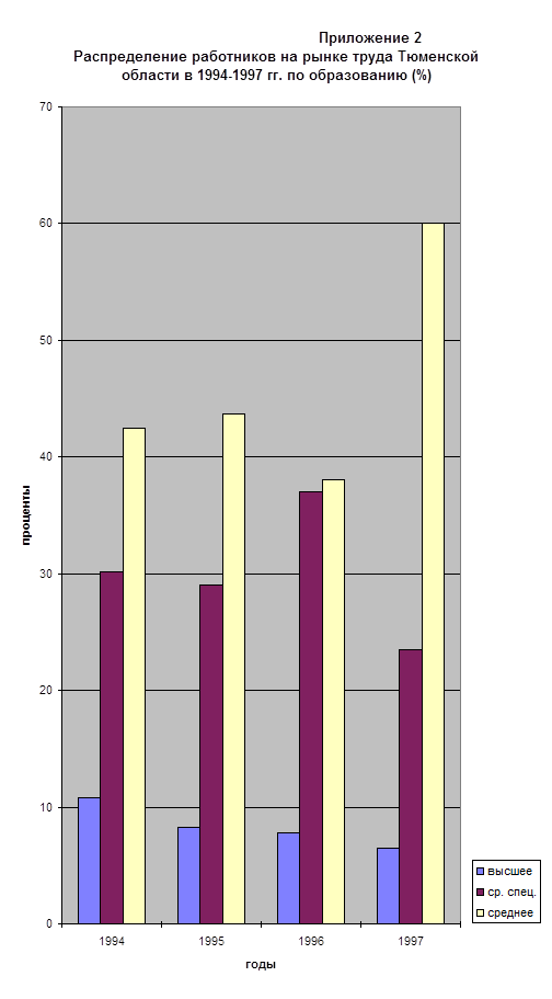 2. Диаграмма распределения работников на рынке труда Тюменской области в 1994-1997 гг. по образованию